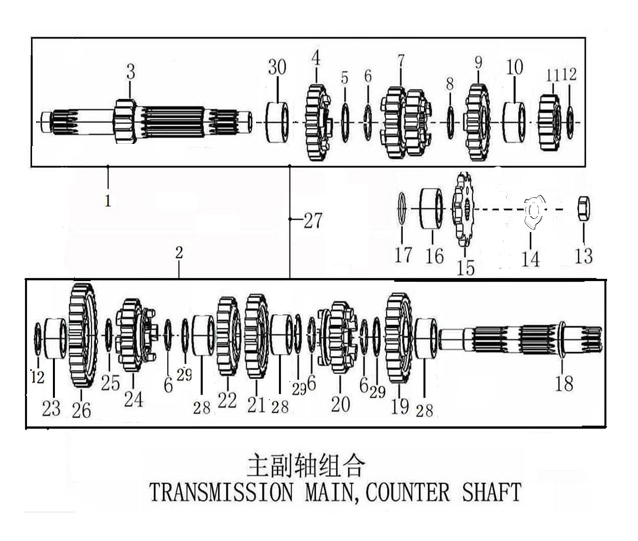 ZONGSHEN 2024 NC250SR | 主副轴组合 TRANSMISSION MAIN,COUNTER SHAFT | 2 | 100134173 | Coutershaft Transmission | ![]() | |
